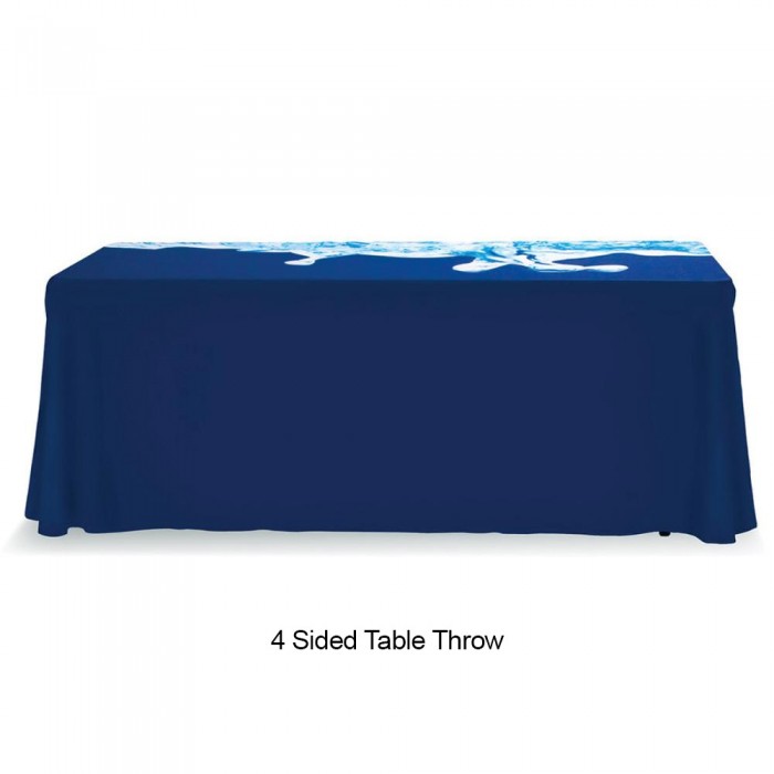 Table throws are a great addition to your trade show booth and are sized to fit standard 4ft, 6ft, and 8ft tables. Available in full graphic prints. The Open Back version has full length front and side material, with a shorter edge on the backside. The Full Back version has full length material on the front, back and both sides of the table.